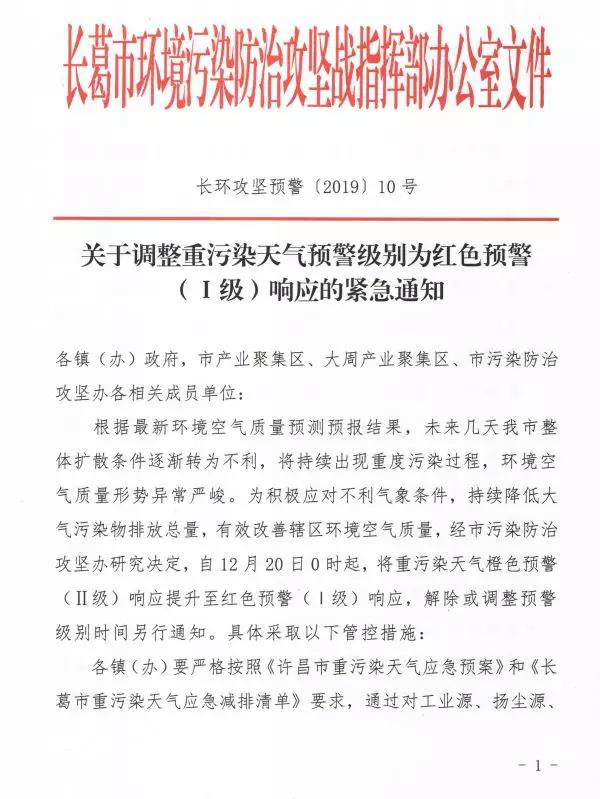 关于调整重污染天气预警级别为红色预警(Ⅰ级)响应的紧急通知